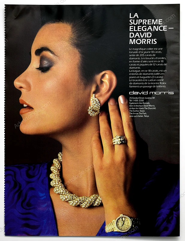 This David Morris jewelry original print ad comes from a magazine published in 1985. Not a reproduction or reprint.