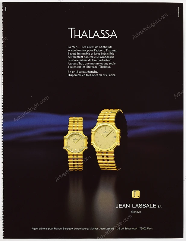 This Jean Lassale Thalassa watches original print ad comes from a magazine published in 1986. Not a reproduction or reprint.