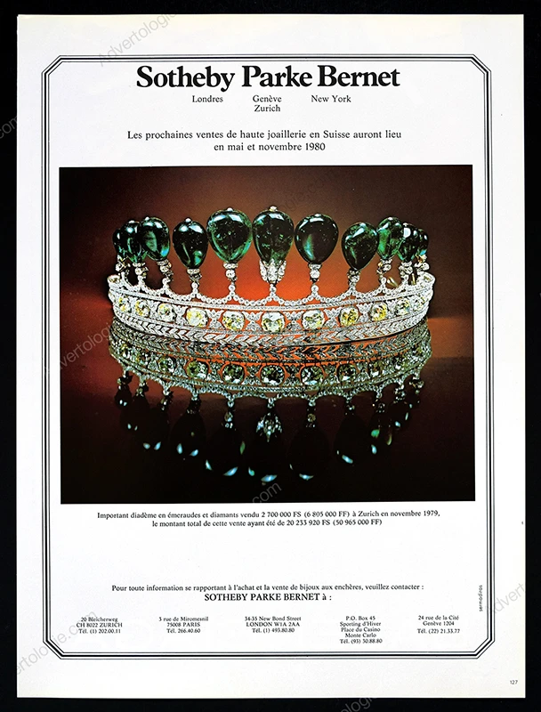 The ad advertises the emerald and diamond Henckel Von Donnersmarck Tiara auction.