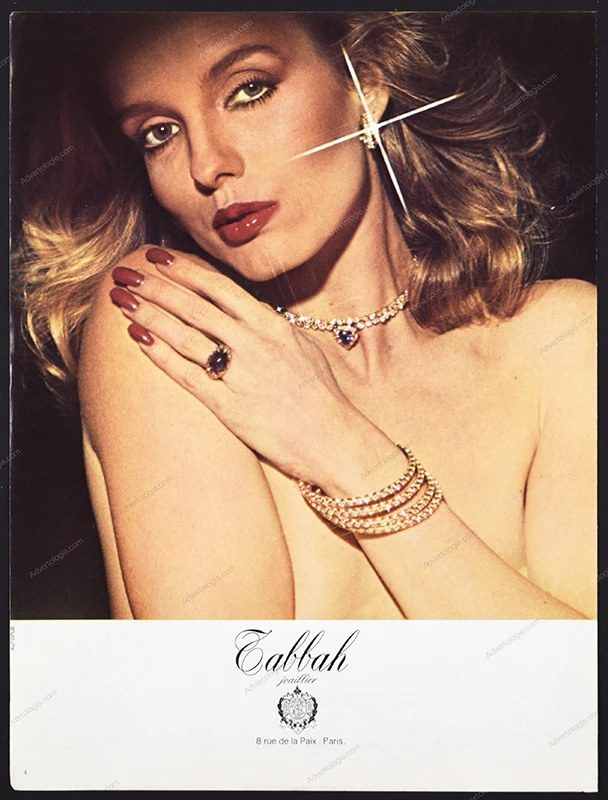 This Tabbah jewelry original print ad comes from a magazine published in 1985. Not a reproduction or reprint.